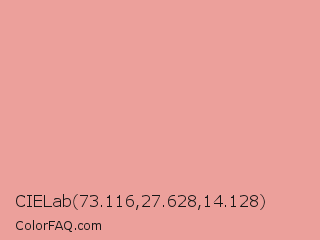 CIELab 73.116,27.628,14.128 Color is a light red color and the nearest color is Sea Pink #ed989e. Hex code #eca09b and RGB value is rgb(236,160,155). In RGB color space, this color is composed of 93% red, 63% green, 61% blue, In CMYK color space, this color is composed of 0% cyan, 32% magenta, 34% yellow , 7% black , In HSL color space, this color has a hue angle of 4° , 68% saturation and 77% lightness.