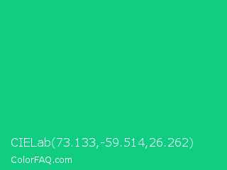 CIELab 73.133,-59.514,26.262 Color is a normal green color and the nearest color is Mountain Meadow Crayola #1ab385. Hex code #11cd81 and RGB value is rgb(17,205,129). In RGB color space, this color is composed of 7% red, 80% green, 51% blue, In CMYK color space, this color is composed of 92% cyan, 0% magenta, 37% yellow , 20% black , In HSL color space, this color has a hue angle of 156° , 85% saturation and 44% lightness.