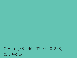 CIELab 73.146,-32.75,-0.258 Color is a normal cyan color and the nearest color is Tradewind #5fb3ac. Hex code #63c4b3 and RGB value is rgb(99,196,179). In RGB color space, this color is composed of 39% red, 77% green, 70% blue, In CMYK color space, this color is composed of 49% cyan, 0% magenta, 9% yellow , 23% black , In HSL color space, this color has a hue angle of 169° , 45% saturation and 58% lightness.