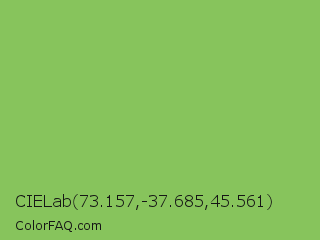 CIELab 73.157,-37.685,45.561 Color is a normal green color and the nearest color is Dollar Bill #85bb65. Hex code #87c45c and RGB value is rgb(135,196,92). In RGB color space, this color is composed of 53% red, 77% green, 36% blue, In CMYK color space, this color is composed of 31% cyan, 0% magenta, 53% yellow , 23% black , In HSL color space, this color has a hue angle of 95° , 47% saturation and 56% lightness.