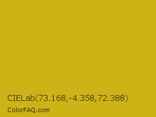 CIELab 73.168,-4.358,72.388 Color is a normal yellow color and the nearest color is Galliano #dcb20c. Hex code #ceb316 and RGB value is rgb(206,179,22). In RGB color space, this color is composed of 81% red, 70% green, 9% blue, In CMYK color space, this color is composed of 0% cyan, 13% magenta, 89% yellow , 19% black , In HSL color space, this color has a hue angle of 51° , 81% saturation and 45% lightness.