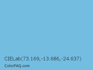 CIELab 73.169,-13.686,-24.637 Color is a light blue color and the nearest color is Aero #7cb9e8. Hex code #73bde0 and RGB value is rgb(115,189,224). In RGB color space, this color is composed of 45% red, 74% green, 88% blue, In CMYK color space, this color is composed of 49% cyan, 16% magenta, 0% yellow , 12% black , In HSL color space, this color has a hue angle of 199° , 64% saturation and 66% lightness.