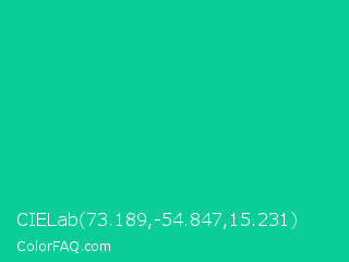 CIELab 73.189,-54.847,15.231 Color is a normal green color and the nearest color is Caribbean Green #00cc99. Hex code #0acc96 and RGB value is rgb(10,204,150). In RGB color space, this color is composed of 4% red, 80% green, 59% blue, In CMYK color space, this color is composed of 95% cyan, 0% magenta, 26% yellow , 20% black , In HSL color space, this color has a hue angle of 163° , 91% saturation and 42% lightness.