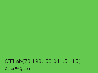CIELab 73.193,-53.041,51.15 Color is a normal green color and the nearest color is Mantis #74c365. Hex code #63ca4f and RGB value is rgb(99,202,79). In RGB color space, this color is composed of 39% red, 79% green, 31% blue, In CMYK color space, this color is composed of 51% cyan, 0% magenta, 61% yellow , 21% black , In HSL color space, this color has a hue angle of 110° , 54% saturation and 55% lightness.