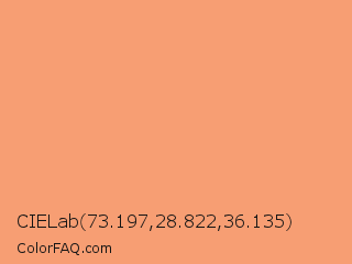 CIELab 73.197,28.822,36.135 Color is a light orange color and the nearest color is Light Salmon #ffa07a. Hex code #f79e73 and RGB value is rgb(247,158,115). In RGB color space, this color is composed of 97% red, 62% green, 45% blue, In CMYK color space, this color is composed of 0% cyan, 36% magenta, 53% yellow , 3% black , In HSL color space, this color has a hue angle of 20° , 89% saturation and 71% lightness.