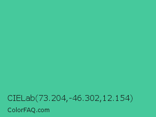 CIELab 73.204,-46.302,12.154 Color is a normal green color and the nearest color is Ocean Green #48bf91. Hex code #46c99c and RGB value is rgb(70,201,156). In RGB color space, this color is composed of 27% red, 79% green, 61% blue, In CMYK color space, this color is composed of 65% cyan, 0% magenta, 22% yellow , 21% black , In HSL color space, this color has a hue angle of 159° , 55% saturation and 53% lightness.
