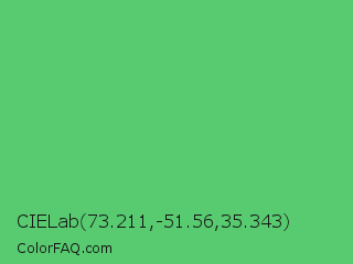 CIELab 73.211,-51.56,35.343 Color is a normal green color and the nearest color is Emerald #50c878. Hex code #58ca70 and RGB value is rgb(88,202,112). In RGB color space, this color is composed of 35% red, 79% green, 44% blue, In CMYK color space, this color is composed of 56% cyan, 0% magenta, 45% yellow , 21% black , In HSL color space, this color has a hue angle of 133° , 52% saturation and 57% lightness.