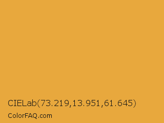 CIELab 73.219,13.951,61.645 Color is a normal orange color and the nearest color is Tulip Tree #eab33b. Hex code #e8a83d and RGB value is rgb(232,168,61). In RGB color space, this color is composed of 91% red, 66% green, 24% blue, In CMYK color space, this color is composed of 0% cyan, 28% magenta, 74% yellow , 9% black , In HSL color space, this color has a hue angle of 38° , 79% saturation and 57% lightness.
