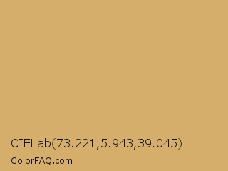 CIELab 73.221,5.943,39.045 Color is a light orange color and the nearest color is Laser #c8b568. Hex code #d5ae6c and RGB value is rgb(213,174,108). In RGB color space, this color is composed of 84% red, 68% green, 42% blue, In CMYK color space, this color is composed of 0% cyan, 18% magenta, 49% yellow , 16% black , In HSL color space, this color has a hue angle of 38° , 56% saturation and 63% lightness.