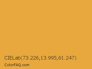 CIELab 73.226,13.995,61.247 Color is a normal orange color and the nearest color is Tulip Tree #eab33b. Hex code #e8a83e and RGB value is rgb(232,168,62). In RGB color space, this color is composed of 91% red, 66% green, 24% blue, In CMYK color space, this color is composed of 0% cyan, 28% magenta, 73% yellow , 9% black , In HSL color space, this color has a hue angle of 37° , 79% saturation and 58% lightness.