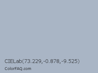 CIELab 73.229,-0.878,-9.525 Color is a light blue color and the nearest color is Cadet Blue #a9b2c3. Hex code #a9b5c5 and RGB value is rgb(169,181,197). In RGB color space, this color is composed of 66% red, 71% green, 77% blue, In CMYK color space, this color is composed of 14% cyan, 8% magenta, 0% yellow , 23% black , In HSL color space, this color has a hue angle of 214° , 19% saturation and 72% lightness.