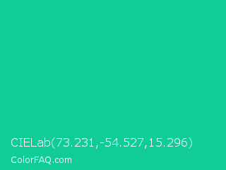 CIELab 73.231,-54.527,15.296 Color is a normal green color and the nearest color is Caribbean Green #00cc99. Hex code #12cc96 and RGB value is rgb(18,204,150). In RGB color space, this color is composed of 7% red, 80% green, 59% blue, In CMYK color space, this color is composed of 91% cyan, 0% magenta, 26% yellow , 20% black , In HSL color space, this color has a hue angle of 163° , 84% saturation and 44% lightness.