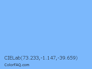 CIELab 73.233,-1.147,-39.659 Color is a light blue color and the nearest color is French Sky Blue #77b5fe. Hex code #7bb8fc and RGB value is rgb(123,184,252). In RGB color space, this color is composed of 48% red, 72% green, 99% blue, In CMYK color space, this color is composed of 51% cyan, 27% magenta, 0% yellow , 1% black , In HSL color space, this color has a hue angle of 212° , 96% saturation and 74% lightness.