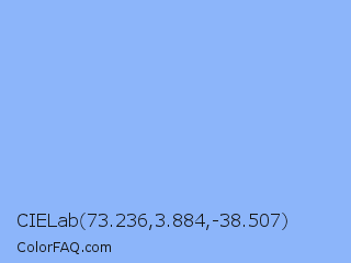 CIELab 73.236,3.884,-38.507 Color is a light blue color and the nearest color is Jordy Blue #8ab9f1. Hex code #8cb5fa and RGB value is rgb(140,181,250). In RGB color space, this color is composed of 55% red, 71% green, 98% blue, In CMYK color space, this color is composed of 44% cyan, 28% magenta, 0% yellow , 2% black , In HSL color space, this color has a hue angle of 218° , 92% saturation and 76% lightness.