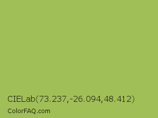 CIELab 73.237,-26.094,48.412 Color is a normal lime color and the nearest color is Middle Green Yellow #acbf60. Hex code #a1bf57 and RGB value is rgb(161,191,87). In RGB color space, this color is composed of 63% red, 75% green, 34% blue, In CMYK color space, this color is composed of 16% cyan, 0% magenta, 54% yellow , 25% black , In HSL color space, this color has a hue angle of 77° , 45% saturation and 55% lightness.