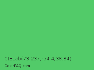 CIELab 73.237,-54.4,38.84 Color is a normal green color and the nearest color is Emerald #50c878. Hex code #52cb69 and RGB value is rgb(82,203,105). In RGB color space, this color is composed of 32% red, 80% green, 41% blue, In CMYK color space, this color is composed of 60% cyan, 0% magenta, 48% yellow , 20% black , In HSL color space, this color has a hue angle of 131° , 54% saturation and 56% lightness.