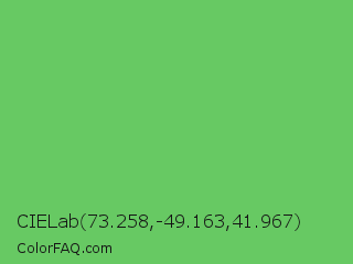 CIELab 73.258,-49.163,41.967 Color is a normal green color and the nearest color is Mantis #74c365. Hex code #67c963 and RGB value is rgb(103,201,99). In RGB color space, this color is composed of 40% red, 79% green, 39% blue, In CMYK color space, this color is composed of 49% cyan, 0% magenta, 51% yellow , 21% black , In HSL color space, this color has a hue angle of 118° , 49% saturation and 59% lightness.
