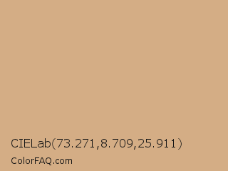 CIELab 73.271,8.709,25.911 Color is a light orange color and the nearest color is Tan #d2b48c. Hex code #d4ad85 and RGB value is rgb(212,173,133). In RGB color space, this color is composed of 83% red, 68% green, 52% blue, In CMYK color space, this color is composed of 0% cyan, 18% magenta, 37% yellow , 17% black , In HSL color space, this color has a hue angle of 30° , 48% saturation and 68% lightness.
