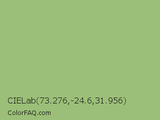 CIELab 73.276,-24.6,31.956 Color is a light green color and the nearest color is Olivine #9ab973. Hex code #9bbf78 and RGB value is rgb(155,191,120). In RGB color space, this color is composed of 61% red, 75% green, 47% blue, In CMYK color space, this color is composed of 19% cyan, 0% magenta, 37% yellow , 25% black , In HSL color space, this color has a hue angle of 90° , 36% saturation and 61% lightness.