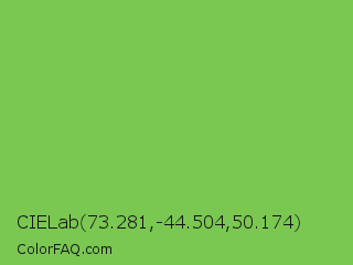 CIELab 73.281,-44.504,50.174 Color is a normal green color and the nearest color is Mantis #74c365. Hex code #7ac752 and RGB value is rgb(122,199,82). In RGB color space, this color is composed of 48% red, 78% green, 32% blue, In CMYK color space, this color is composed of 39% cyan, 0% magenta, 59% yellow , 22% black , In HSL color space, this color has a hue angle of 99° , 51% saturation and 55% lightness.