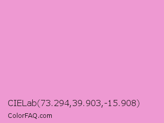 CIELab 73.294,39.903,-15.908 Color is a light magenta color and the nearest color is Light Orchid #e29cd2. Hex code #ee99d2 and RGB value is rgb(238,153,210). In RGB color space, this color is composed of 93% red, 60% green, 82% blue, In CMYK color space, this color is composed of 0% cyan, 36% magenta, 12% yellow , 7% black , In HSL color space, this color has a hue angle of 320° , 71% saturation and 77% lightness.