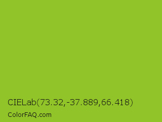 CIELab 73.32,-37.889,66.418 Color is a normal green color and the nearest color is Atlantis #97cd2d. Hex code #91c428 and RGB value is rgb(145,196,40). In RGB color space, this color is composed of 57% red, 77% green, 16% blue, In CMYK color space, this color is composed of 26% cyan, 0% magenta, 80% yellow , 23% black , In HSL color space, this color has a hue angle of 80° , 66% saturation and 46% lightness.