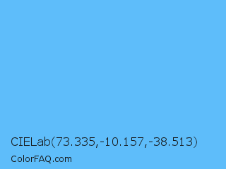 CIELab 73.335,-10.157,-38.513 Color is a light blue color and the nearest color is Blue Jeans #5dadec. Hex code #5ebdfa and RGB value is rgb(94,189,250). In RGB color space, this color is composed of 37% red, 74% green, 98% blue, In CMYK color space, this color is composed of 62% cyan, 24% magenta, 0% yellow , 2% black , In HSL color space, this color has a hue angle of 203° , 94% saturation and 67% lightness.