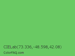 CIELab 73.336,-48.598,42.08 Color is a normal green color and the nearest color is Mantis #74c365. Hex code #69c963 and RGB value is rgb(105,201,99). In RGB color space, this color is composed of 41% red, 79% green, 39% blue, In CMYK color space, this color is composed of 48% cyan, 0% magenta, 51% yellow , 21% black , In HSL color space, this color has a hue angle of 116° , 49% saturation and 59% lightness.