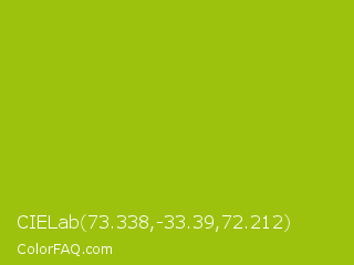 CIELab 73.338,-33.39,72.212 Color is a normal lime color and the nearest color is Pistachio Green #9dc209. Hex code #9cc20d and RGB value is rgb(156,194,13). In RGB color space, this color is composed of 61% red, 76% green, 5% blue, In CMYK color space, this color is composed of 20% cyan, 0% magenta, 93% yellow , 24% black , In HSL color space, this color has a hue angle of 73° , 87% saturation and 41% lightness.