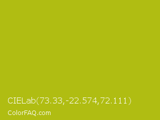 CIELab 73.33,-22.574,72.111 Color is a normal yellow color and the nearest color is La Rioja #b3c110. Hex code #b0bd12 and RGB value is rgb(176,189,18). In RGB color space, this color is composed of 69% red, 74% green, 7% blue, In CMYK color space, this color is composed of 7% cyan, 0% magenta, 90% yellow , 26% black , In HSL color space, this color has a hue angle of 65° , 83% saturation and 41% lightness.