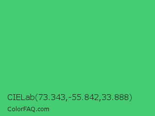 CIELab 73.343,-55.842,33.888 Color is a normal green color and the nearest color is UFO Green #3cd070. Hex code #45cc73 and RGB value is rgb(69,204,115). In RGB color space, this color is composed of 27% red, 80% green, 45% blue, In CMYK color space, this color is composed of 66% cyan, 0% magenta, 44% yellow , 20% black , In HSL color space, this color has a hue angle of 140° , 57% saturation and 54% lightness.