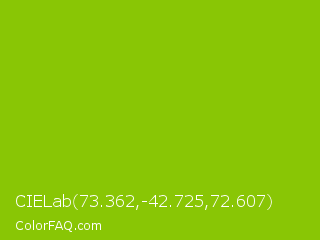 CIELab 73.362,-42.725,72.607 Color is a normal lime color and the nearest color is Sheen Green #8fd400. Hex code #89c605 and RGB value is rgb(137,198,5). In RGB color space, this color is composed of 54% red, 78% green, 2% blue, In CMYK color space, this color is composed of 31% cyan, 0% magenta, 97% yellow , 22% black , In HSL color space, this color has a hue angle of 79° , 95% saturation and 40% lightness.