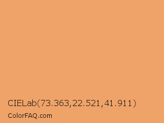 CIELab 73.363,22.521,41.911 Color is a light orange color and the nearest color is Sandy Brown #f4a460. Hex code #f0a368 and RGB value is rgb(240,163,104). In RGB color space, this color is composed of 94% red, 64% green, 41% blue, In CMYK color space, this color is composed of 0% cyan, 32% magenta, 57% yellow , 6% black , In HSL color space, this color has a hue angle of 26° , 82% saturation and 67% lightness.