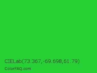 CIELab 73.367,-69.698,61.79 Color is a normal green color and the nearest color is Lime Green #32cd32. Hex code #24d033 and RGB value is rgb(36,208,51). In RGB color space, this color is composed of 14% red, 82% green, 20% blue, In CMYK color space, this color is composed of 83% cyan, 0% magenta, 75% yellow , 18% black , In HSL color space, this color has a hue angle of 125° , 70% saturation and 48% lightness.