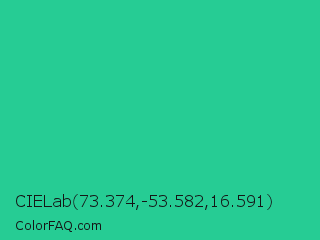 CIELab 73.374,-53.582,16.591 Color is a normal green color and the nearest color is Shamrock #33cc99. Hex code #26cc94 and RGB value is rgb(38,204,148). In RGB color space, this color is composed of 15% red, 80% green, 58% blue, In CMYK color space, this color is composed of 81% cyan, 0% magenta, 27% yellow , 20% black , In HSL color space, this color has a hue angle of 160° , 69% saturation and 47% lightness.