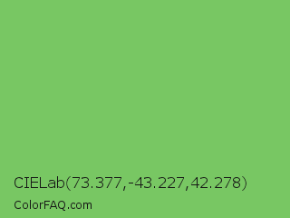 CIELab 73.377,-43.227,42.278 Color is a normal green color and the nearest color is Mantis #74c365. Hex code #78c763 and RGB value is rgb(120,199,99). In RGB color space, this color is composed of 47% red, 78% green, 39% blue, In CMYK color space, this color is composed of 40% cyan, 0% magenta, 50% yellow , 22% black , In HSL color space, this color has a hue angle of 107° , 47% saturation and 58% lightness.