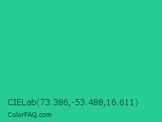 CIELab 73.386,-53.488,16.611 Color is a normal green color and the nearest color is Shamrock #33cc99. Hex code #27cc94 and RGB value is rgb(39,204,148). In RGB color space, this color is composed of 15% red, 80% green, 58% blue, In CMYK color space, this color is composed of 81% cyan, 0% magenta, 27% yellow , 20% black , In HSL color space, this color has a hue angle of 160° , 68% saturation and 48% lightness.