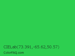 CIELab 73.391,-65.62,50.57 Color is a normal green color and the nearest color is Lime Green #32cd32. Hex code #2dcf50 and RGB value is rgb(45,207,80). In RGB color space, this color is composed of 18% red, 81% green, 31% blue, In CMYK color space, this color is composed of 78% cyan, 0% magenta, 61% yellow , 19% black , In HSL color space, this color has a hue angle of 133° , 64% saturation and 49% lightness.