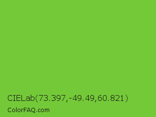 CIELab 73.397,-49.49,60.821 Color is a normal green color and the nearest color is Green RYB #66b032. Hex code #74c938 and RGB value is rgb(116,201,56). In RGB color space, this color is composed of 45% red, 79% green, 22% blue, In CMYK color space, this color is composed of 42% cyan, 0% magenta, 72% yellow , 21% black , In HSL color space, this color has a hue angle of 95° , 57% saturation and 50% lightness.