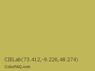 CIELab 73.412,-9.226,48.274 Color is a normal yellow color and the nearest color is Vegas Gold #c5b358. Hex code #c0b759 and RGB value is rgb(192,183,89). In RGB color space, this color is composed of 75% red, 72% green, 35% blue, In CMYK color space, this color is composed of 0% cyan, 5% magenta, 54% yellow , 25% black , In HSL color space, this color has a hue angle of 55° , 45% saturation and 55% lightness.