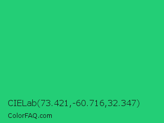 CIELab 73.421,-60.716,32.347 Color is a normal green color and the nearest color is UFO Green #3cd070. Hex code #23ce76 and RGB value is rgb(35,206,118). In RGB color space, this color is composed of 14% red, 81% green, 46% blue, In CMYK color space, this color is composed of 83% cyan, 0% magenta, 43% yellow , 19% black , In HSL color space, this color has a hue angle of 149° , 71% saturation and 47% lightness.