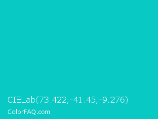 CIELab 73.422,-41.45,-9.276 Color is a normal cyan color and the nearest color is Robins Egg Blue #00cccc. Hex code #08c9c4 and RGB value is rgb(8,201,196). In RGB color space, this color is composed of 3% red, 79% green, 77% blue, In CMYK color space, this color is composed of 96% cyan, 0% magenta, 2% yellow , 21% black , In HSL color space, this color has a hue angle of 178° , 92% saturation and 41% lightness.