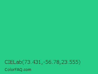 CIELab 73.431,-56.78,23.555 Color is a normal green color and the nearest color is Shamrock #33cc99. Hex code #26cd87 and RGB value is rgb(38,205,135). In RGB color space, this color is composed of 15% red, 80% green, 53% blue, In CMYK color space, this color is composed of 81% cyan, 0% magenta, 34% yellow , 20% black , In HSL color space, this color has a hue angle of 155° , 69% saturation and 48% lightness.