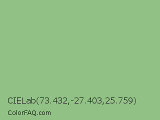 CIELab 73.432,-27.403,25.759 Color is a light green color and the nearest color is Dark Sea Green #8fbc8f. Hex code #91c184 and RGB value is rgb(145,193,132). In RGB color space, this color is composed of 57% red, 76% green, 52% blue, In CMYK color space, this color is composed of 25% cyan, 0% magenta, 32% yellow , 24% black , In HSL color space, this color has a hue angle of 107° , 33% saturation and 64% lightness.