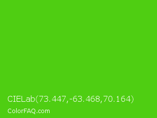 CIELab 73.447,-63.468,70.164 Color is a normal green color and the nearest color is Harlequin Green #46cb18. Hex code #4fce12 and RGB value is rgb(79,206,18). In RGB color space, this color is composed of 31% red, 81% green, 7% blue, In CMYK color space, this color is composed of 62% cyan, 0% magenta, 91% yellow , 19% black , In HSL color space, this color has a hue angle of 101° , 84% saturation and 44% lightness.
