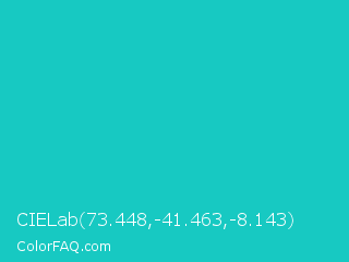 CIELab 73.448,-41.463,-8.143 Color is a normal cyan color and the nearest color is Java #1fc2c2. Hex code #17c9c2 and RGB value is rgb(23,201,194). In RGB color space, this color is composed of 9% red, 79% green, 76% blue, In CMYK color space, this color is composed of 89% cyan, 0% magenta, 3% yellow , 21% black , In HSL color space, this color has a hue angle of 178° , 79% saturation and 44% lightness.