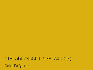 CIELab 73.44,1.938,74.207 Color is a normal yellow color and the nearest color is Galliano #dcb20c. Hex code #d9b00f and RGB value is rgb(217,176,15). In RGB color space, this color is composed of 85% red, 69% green, 6% blue, In CMYK color space, this color is composed of 0% cyan, 19% magenta, 93% yellow , 15% black , In HSL color space, this color has a hue angle of 48° , 87% saturation and 45% lightness.