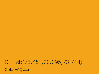 CIELab 73.451,20.096,73.744 Color is a normal orange color and the nearest color is Buttercup #f3ad16. Hex code #f4a419 and RGB value is rgb(244,164,25). In RGB color space, this color is composed of 96% red, 64% green, 10% blue, In CMYK color space, this color is composed of 0% cyan, 33% magenta, 90% yellow , 4% black , In HSL color space, this color has a hue angle of 38° , 91% saturation and 53% lightness.