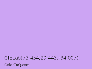CIELab 73.454,29.443,-34.007 Color is a light violet color and the nearest color is Bright Ube #d19fe8. Hex code #cca4f3 and RGB value is rgb(204,164,243). In RGB color space, this color is composed of 80% red, 64% green, 95% blue, In CMYK color space, this color is composed of 16% cyan, 33% magenta, 0% yellow , 5% black , In HSL color space, this color has a hue angle of 270° , 77% saturation and 80% lightness.
