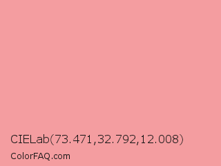 CIELab 73.471,32.792,12.008 Color is a light red color and the nearest color is Sea Pink #ed989e. Hex code #f49da0 and RGB value is rgb(244,157,160). In RGB color space, this color is composed of 96% red, 62% green, 63% blue, In CMYK color space, this color is composed of 0% cyan, 36% magenta, 34% yellow , 4% black , In HSL color space, this color has a hue angle of 358° , 80% saturation and 79% lightness.